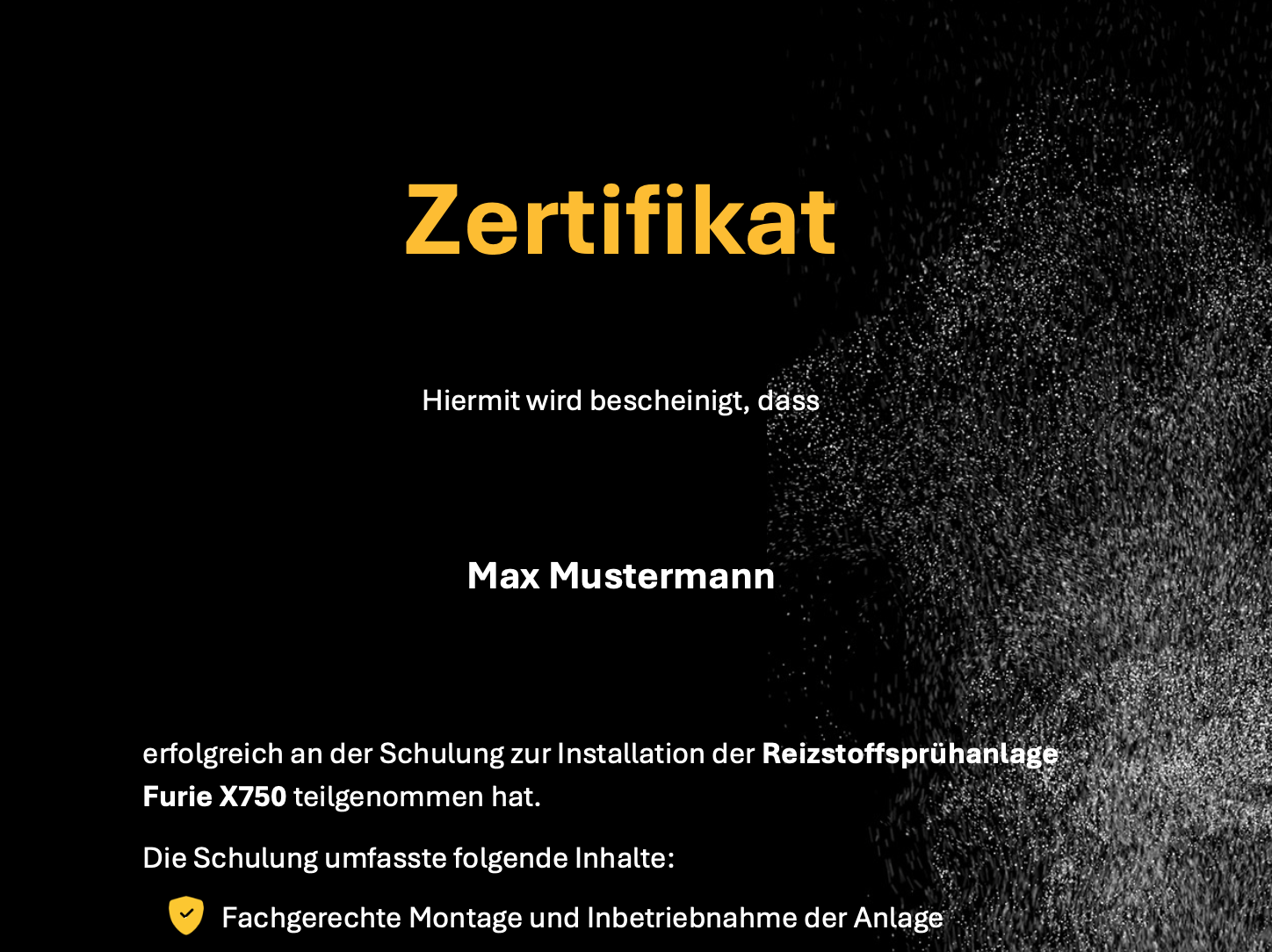 Wir sind Ihr Hersteller für das einzige Zugelassene Reizstoffsprühsystem in Europa und bieten für Ihren Kunden einen echten Mehrwert an Sicherheit.